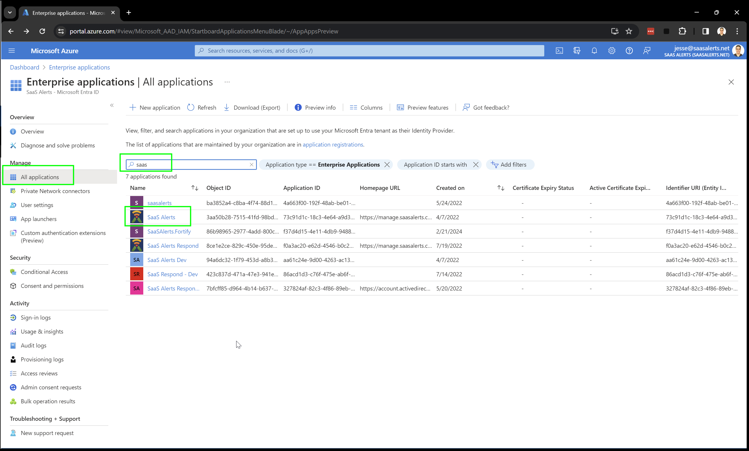 In your customer's Active Directory portal, navigate to Enterprise Applications > All applications > SaaS Alerts.