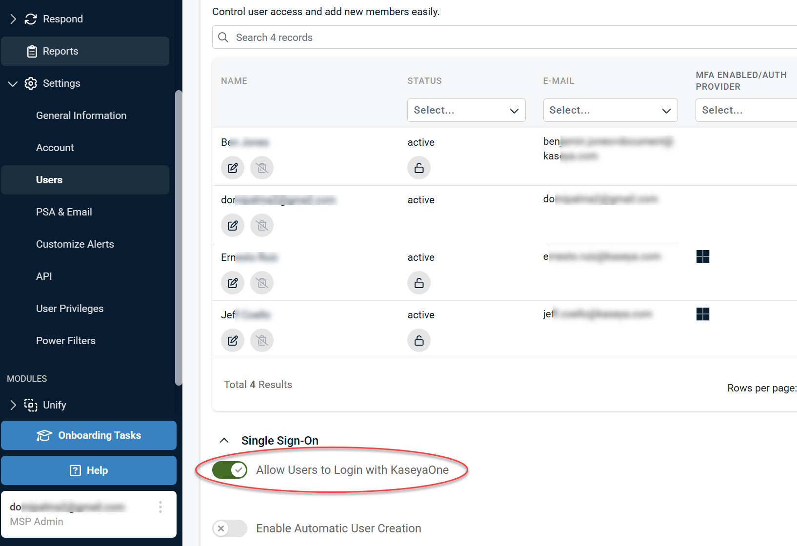 SaaS Alerts supports single sign-on (SSO) with KaseyaOne, making user management and access easier across Kaseya modules. Using Unified Login provides a range of powerful user management tools.