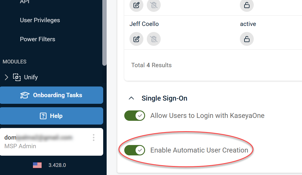 Once enabled, SaaS Alerts allows users to be created automatically through KaseyaOne authentication.
