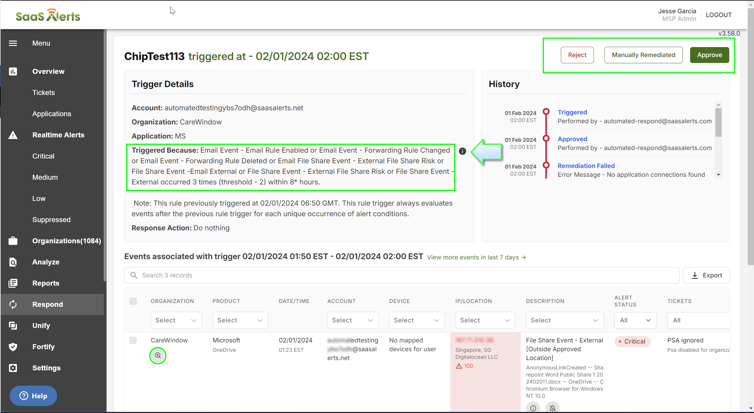 - Reject: The MSP admin of the rule opted out of having Respond take any actions on the specific rule. A SaaS Alerts Respond Notice Rejected alert will be generated.