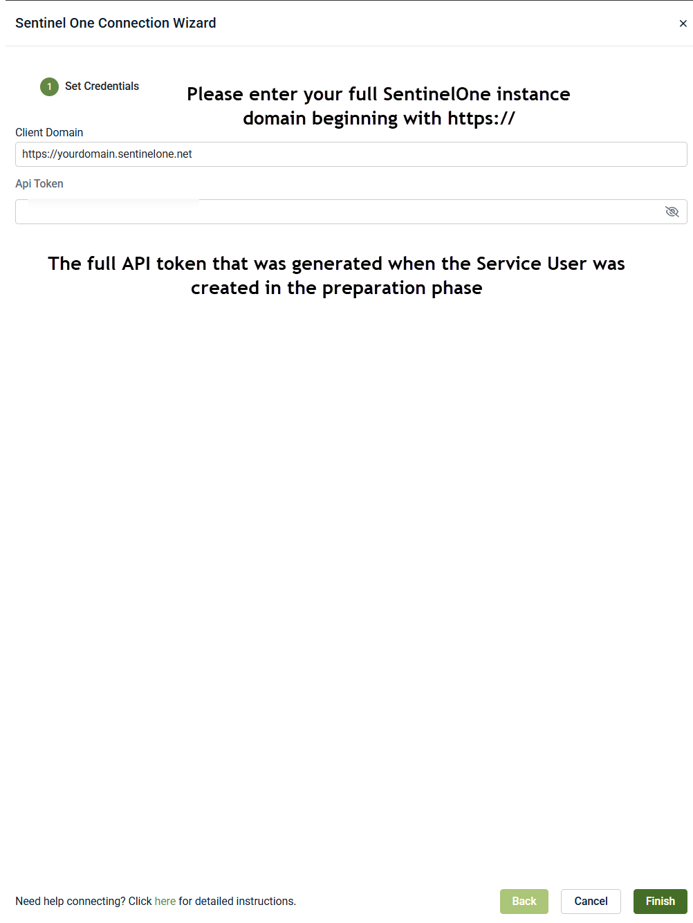 The connection also requires your SentinelOne URL (the address you will log into to create the needed service account).