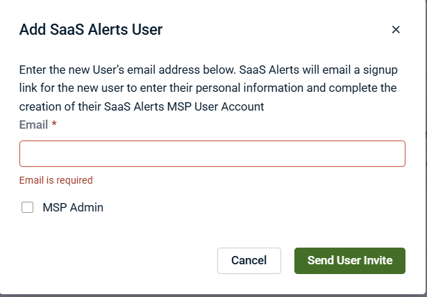NOTE SaaS Alerts will email a signup link for the new user to enter their personal information and complete the creation of their SaaS Alerts MSP user account.
