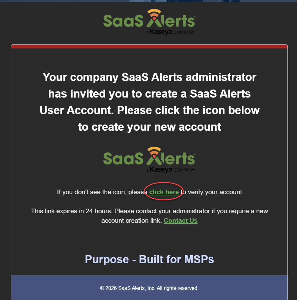 NOTE All SaaS Alerts new MSP users will receive an email invitation for initial access to the platform after their company administrator creates their account. If a newly created MSP user attempts to sign in without clicking the link on the invitation email, they will not be able to sign in to SaaS Alerts. The user or admin will need to contact support@saasalerts.com to remove system locks that prevent authentication and access unless the invitation is acknowledged via email.