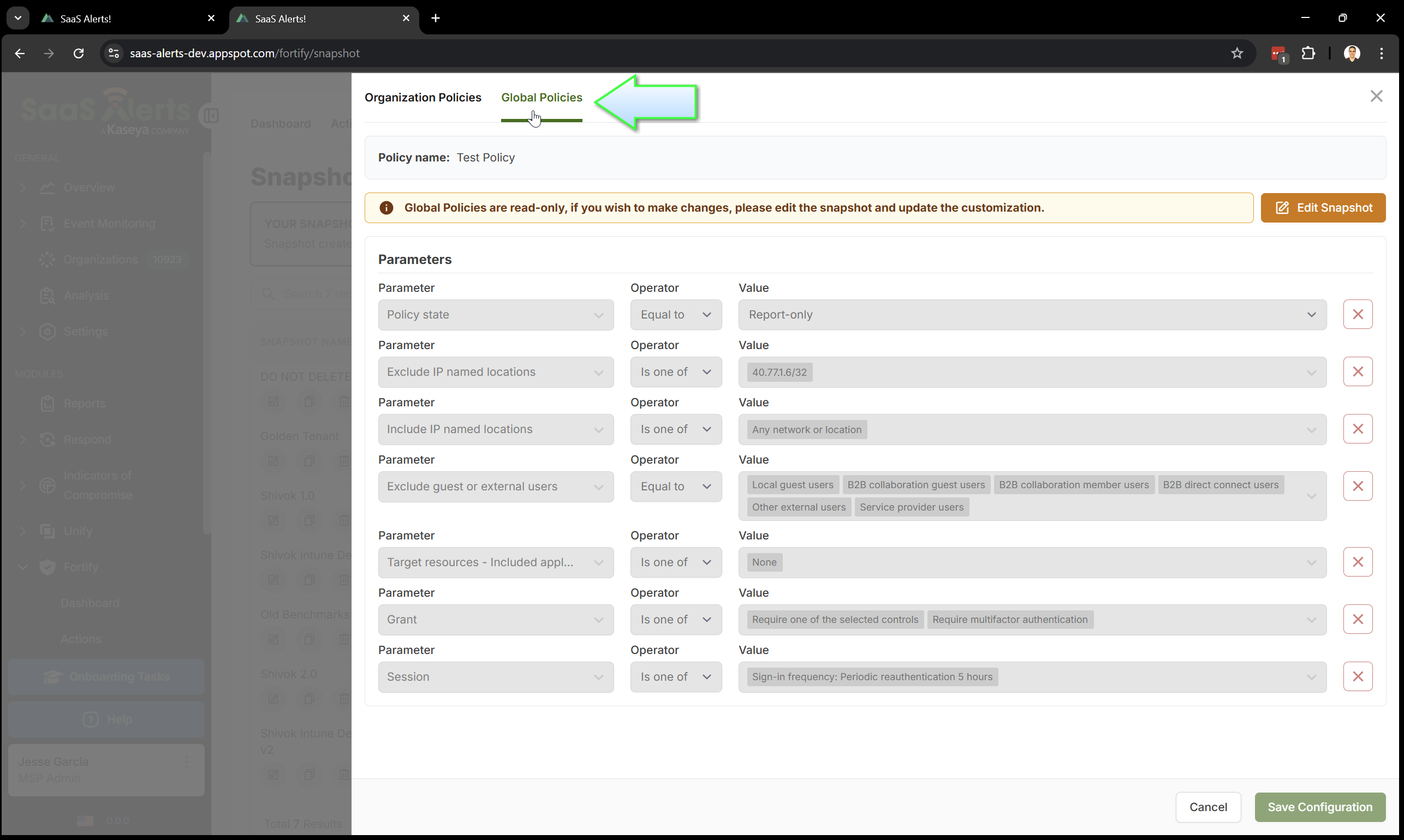 Parameter changes: If the global or organization parameters for the policy snapshot have been altered and no longer match the parameters configured in the organization’s policy, the policy will be adjusted accordingly. This change will be logged, documenting that the parameters were modified and the policy was updated.