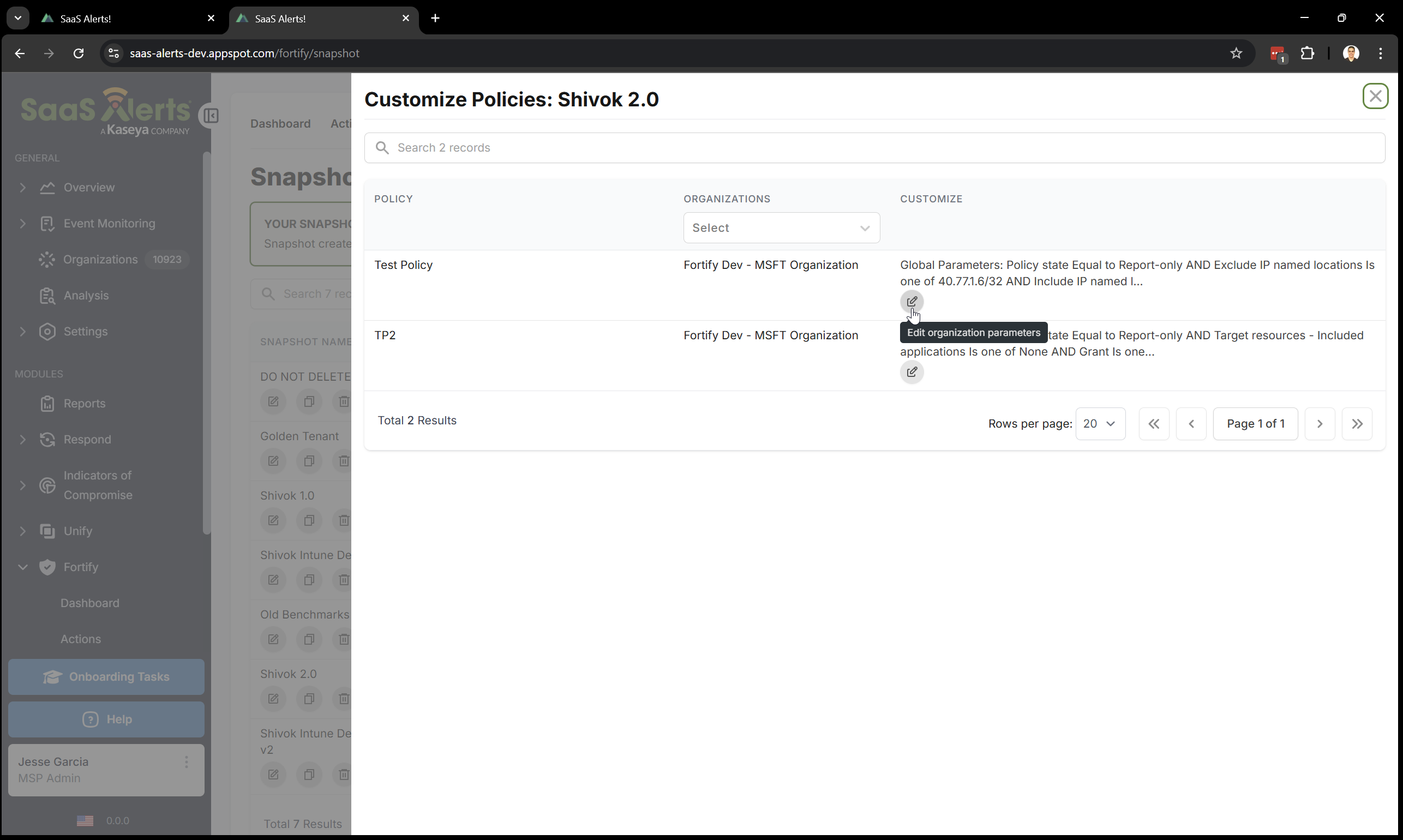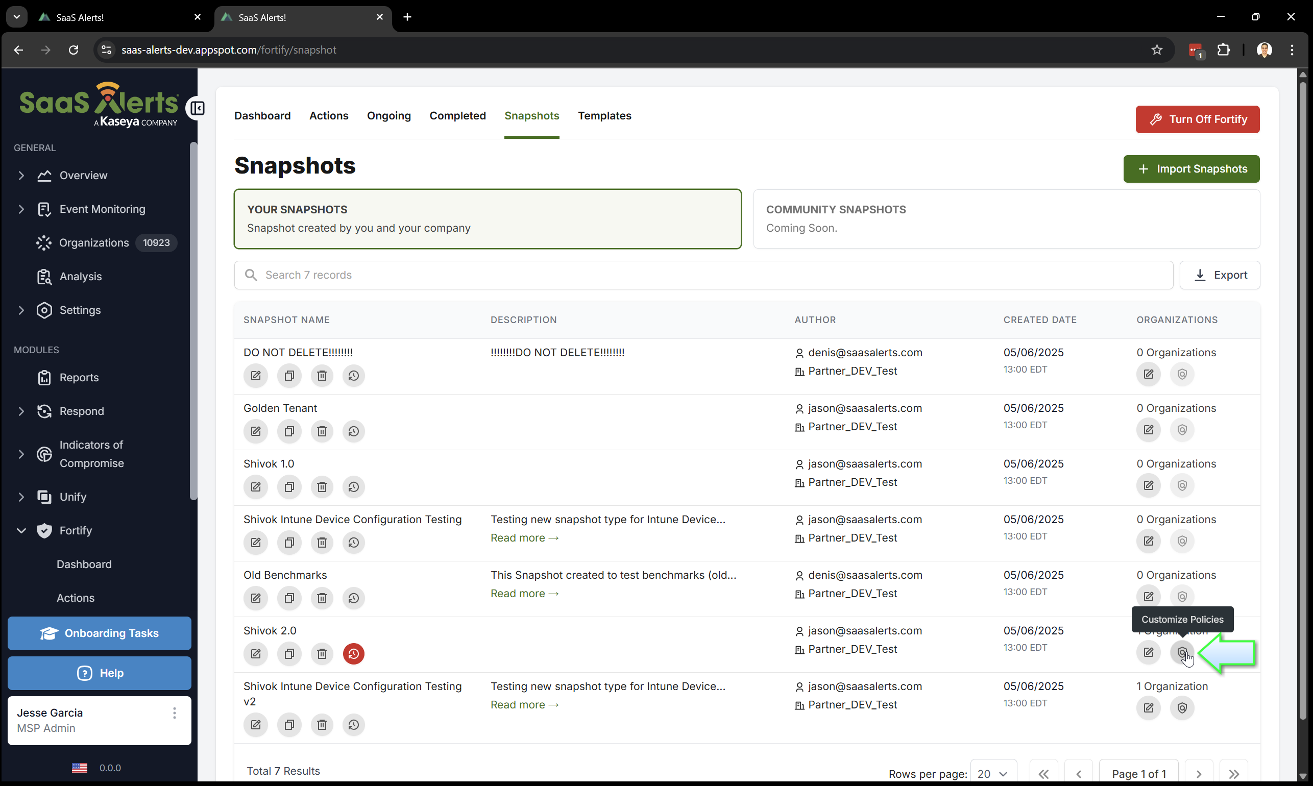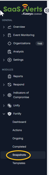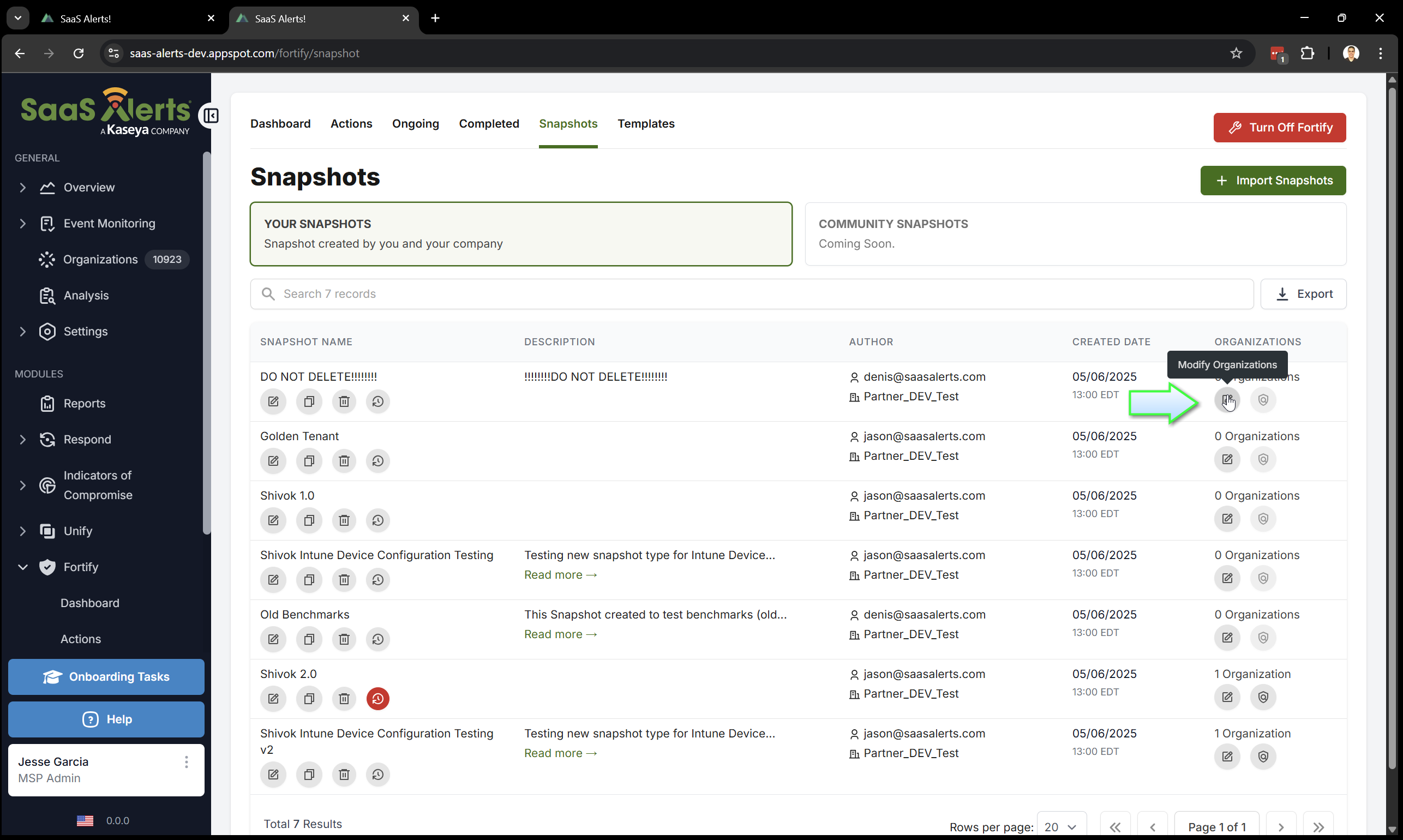 Partners can now add organizations to the Snapshot template from the imported Microsoft tenant by clicking the Modify Organizations icon under the Snapshots tab.