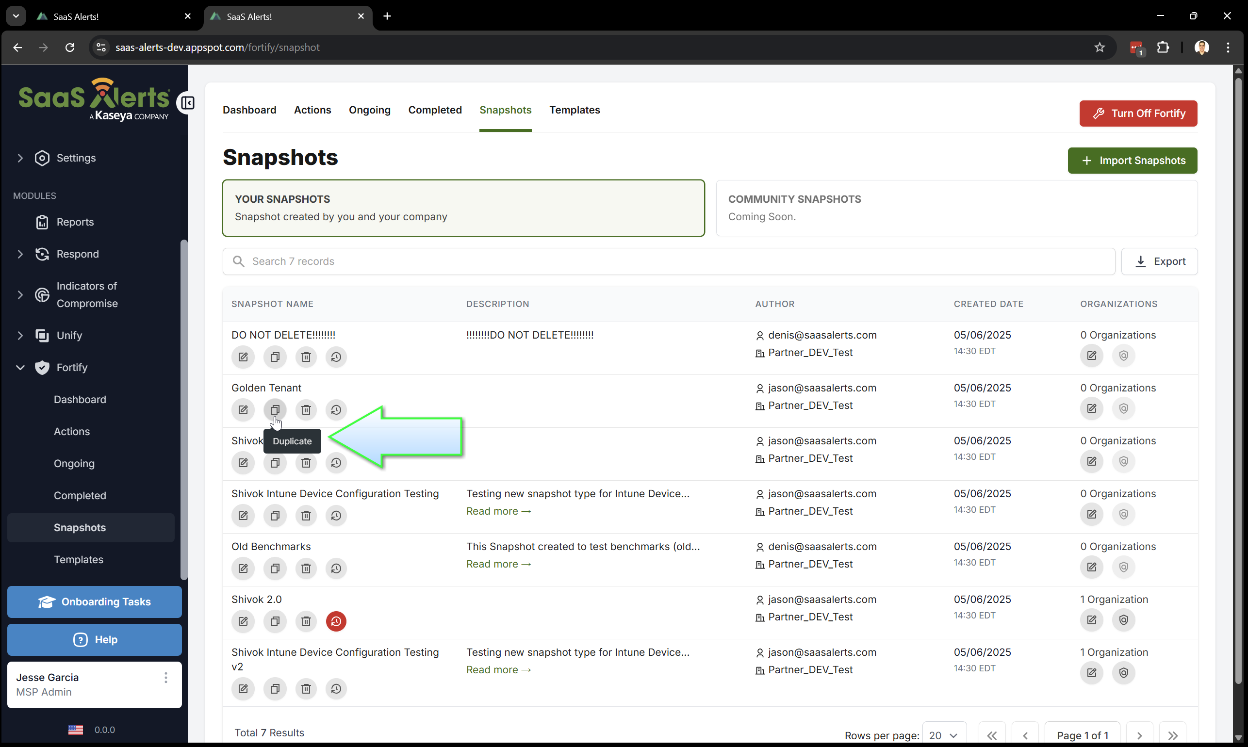 Duplicating a snapshot enables you to keep the original while creating an exact copy of all the policies and parameters. This feature is particularly useful if you want to modify the enabled policies or parameters in the snapshot and test those changes before applying them to your organizations.