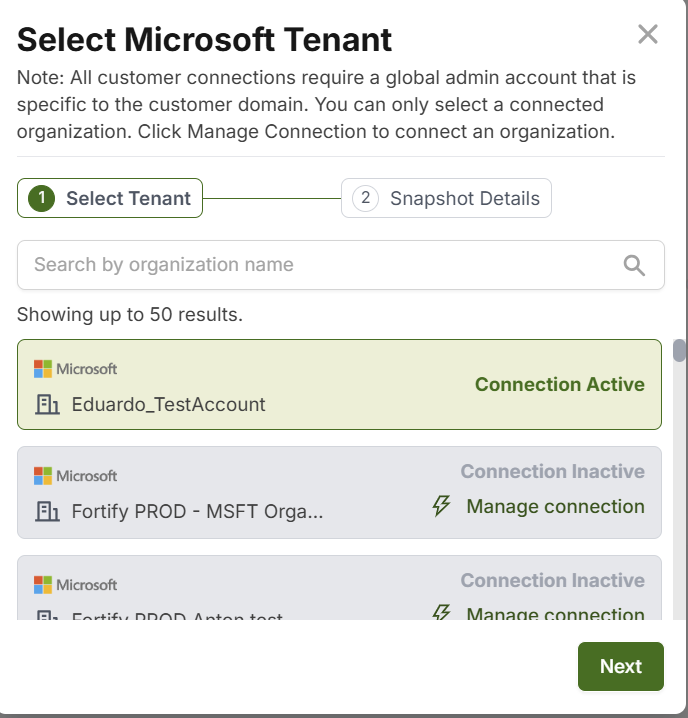 Select a Microsoft tenant to import that is connected to your organization via the Fortify module. Then, click Next.