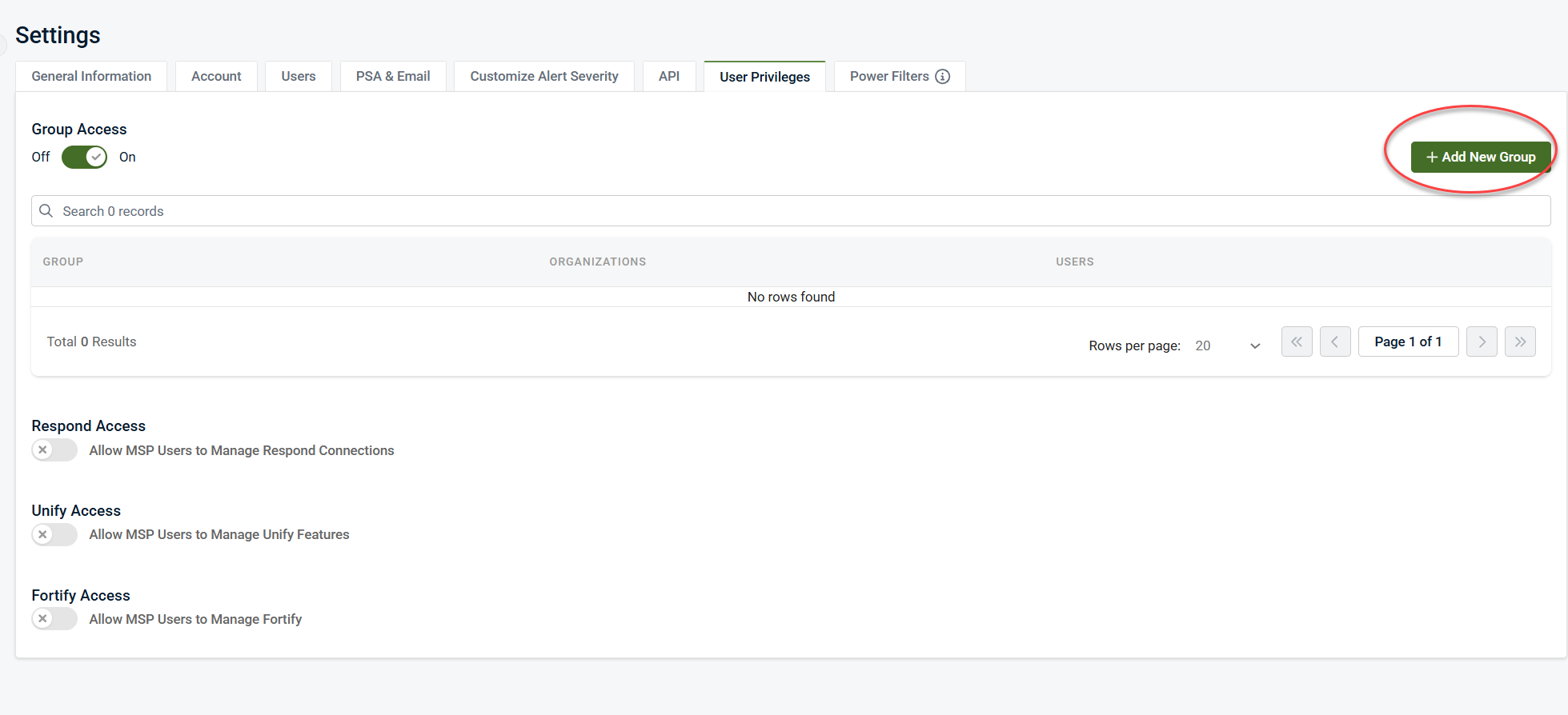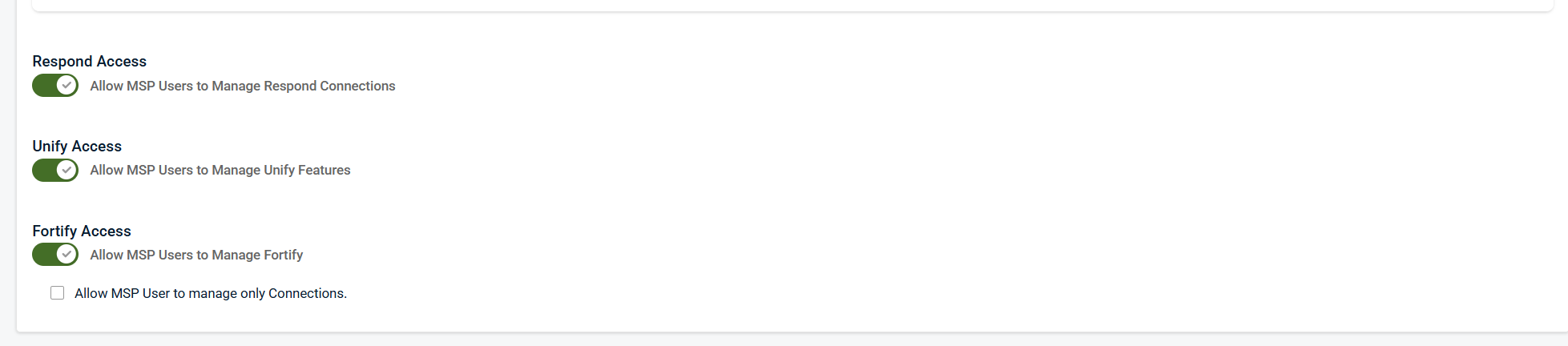 The following options (if enabled) within the User Privileges module allow RBAC group members to manage connections for Respond, Unify, and Fortify. MSP Users may also manage features in Unify and make changes within Fortify. Only MSP Admins have the ability to fully access the content of the Respond module. MSP Users (the users managed by RBAC group membership) may only view and edit organization connections for Respond.