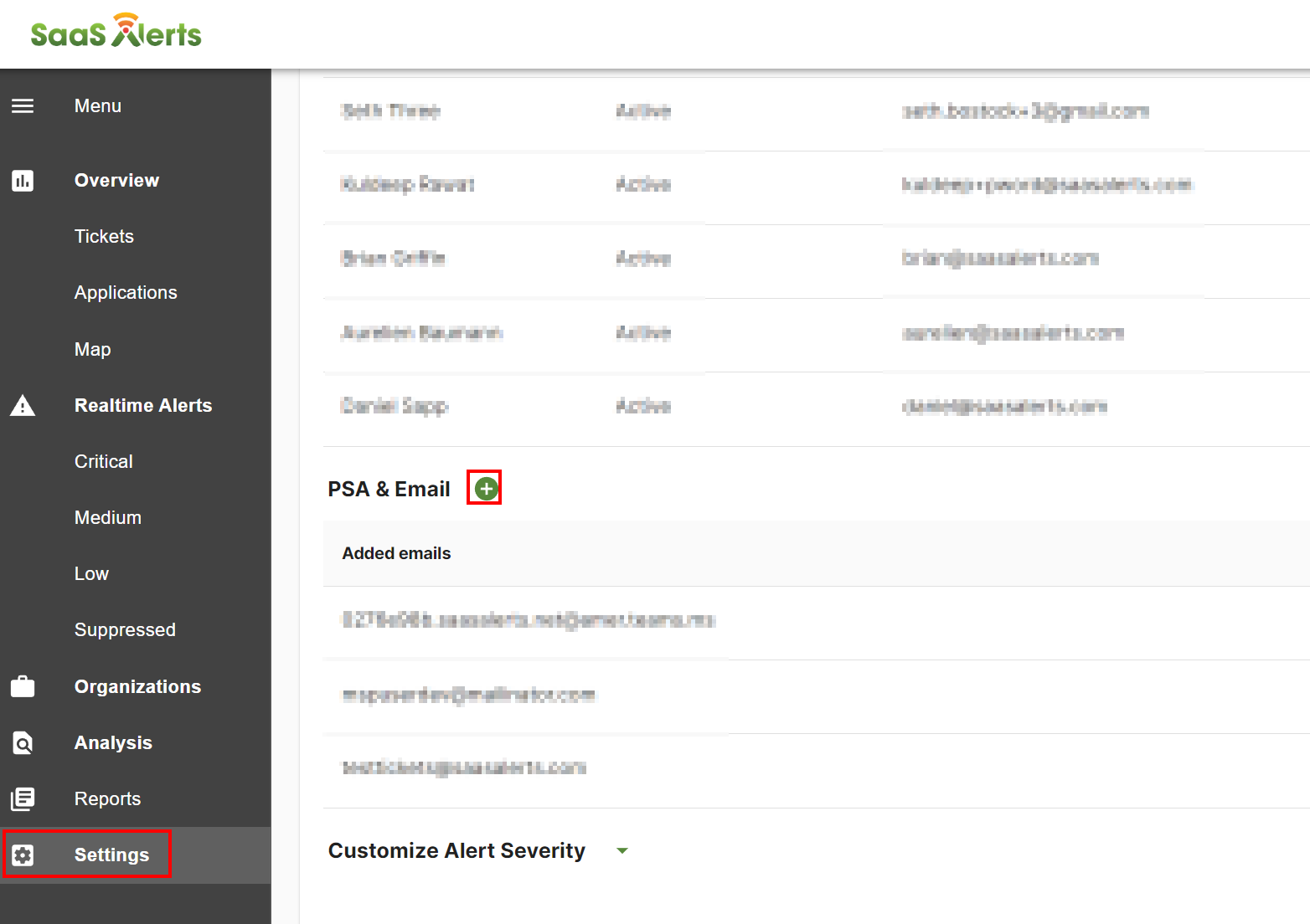 In SaaS Alerts, navigate to Settings > PSA & Email, click the green + icon, and add the address that was generated in the preceding step.