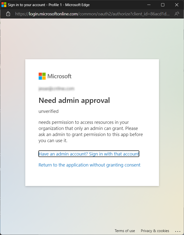 - Click Connect to authenticate using an account with global admin privileges.
