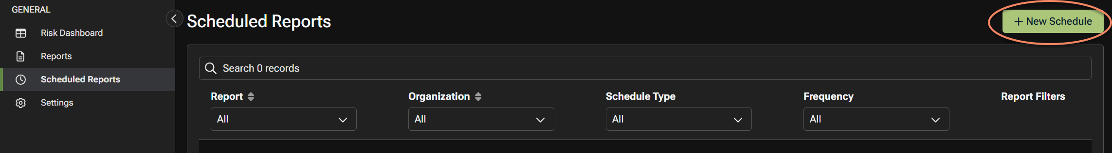 You are taken to the Scheduled Reports page, where existing schedules (if any) are listed and can be filtered by report, organization, schedule type, or frequency.