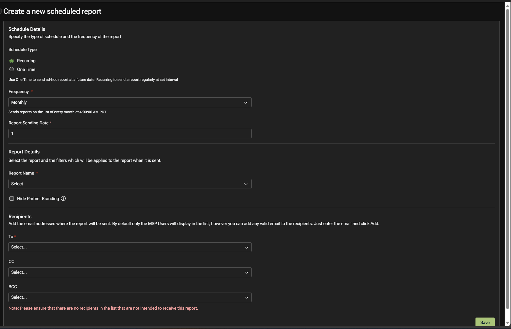 NOTE Choosing Recurring will send the report at the beginning of the preferred frequency at 12:00 AM UTC time zone.